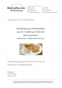 Am 1.11. findet wieder das beliebte Pickertessen statt. Um 14:00 Uhr startet die Wandergruppe am Heimathaus in Borgholzhausen. Die Wanderer und die Nicht-Wanderer treffen sich um 16:00 Uhr in der Gaststätte "Zum Auerhahn". Anmeldung bei Elisabeth Winter 05425 / 933518